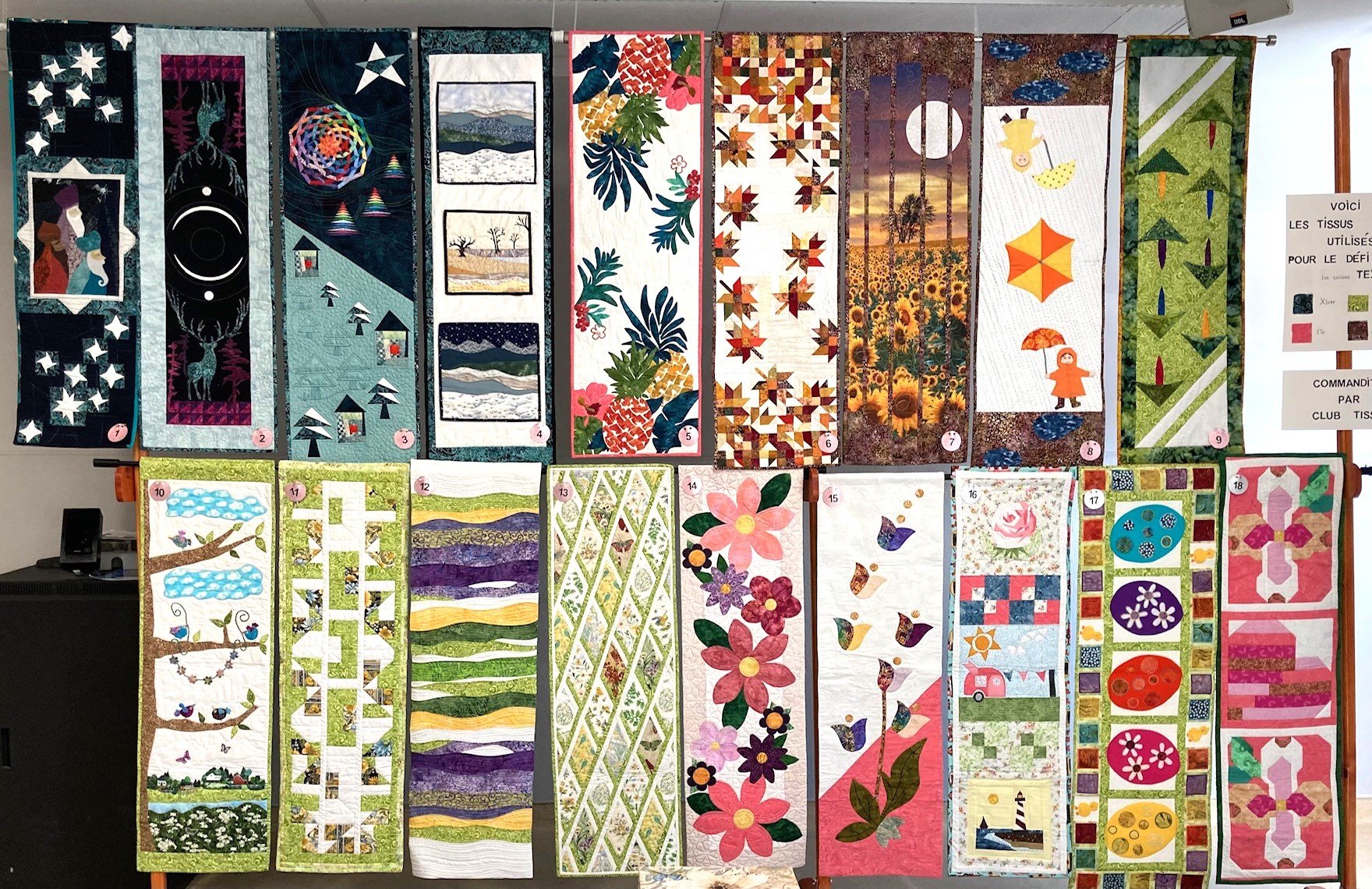 De mai 2024 à novembre 2024, ont été exposés les défis textiles du thème «moderne». Ici les défis tels que vus lors de l’exposition de mai 2024 au Centre Noël-Brulart.