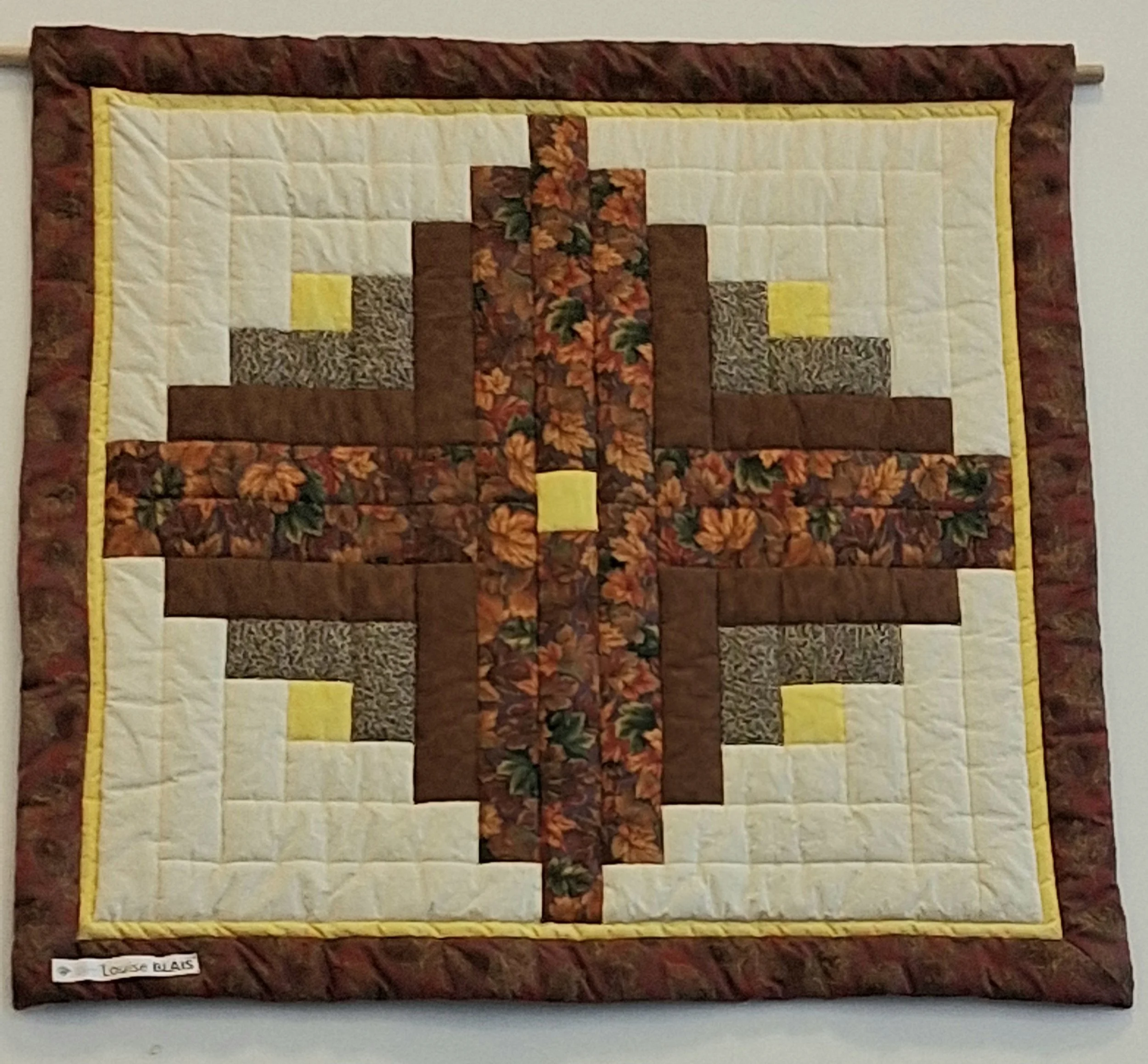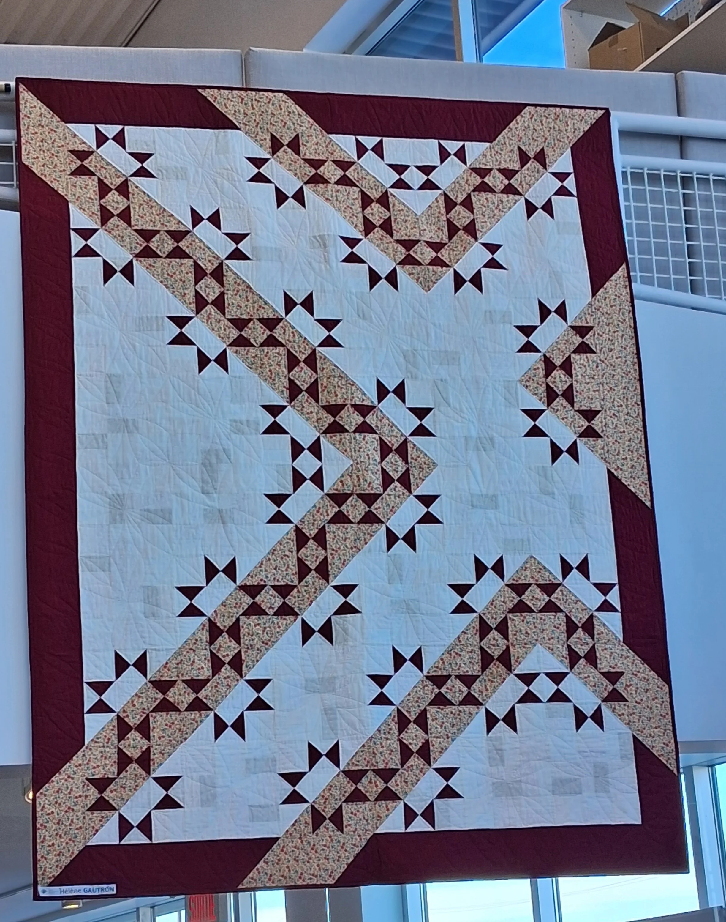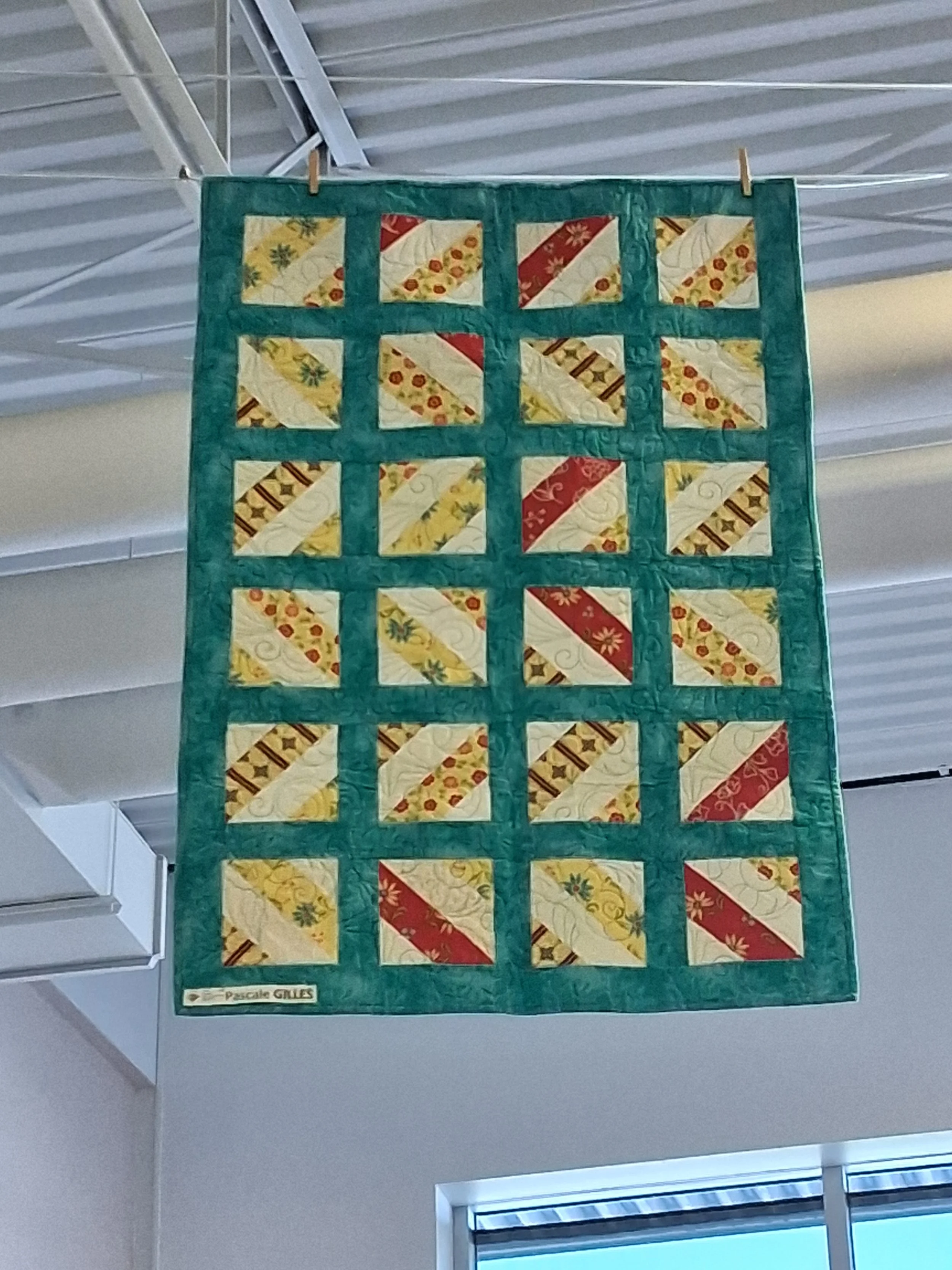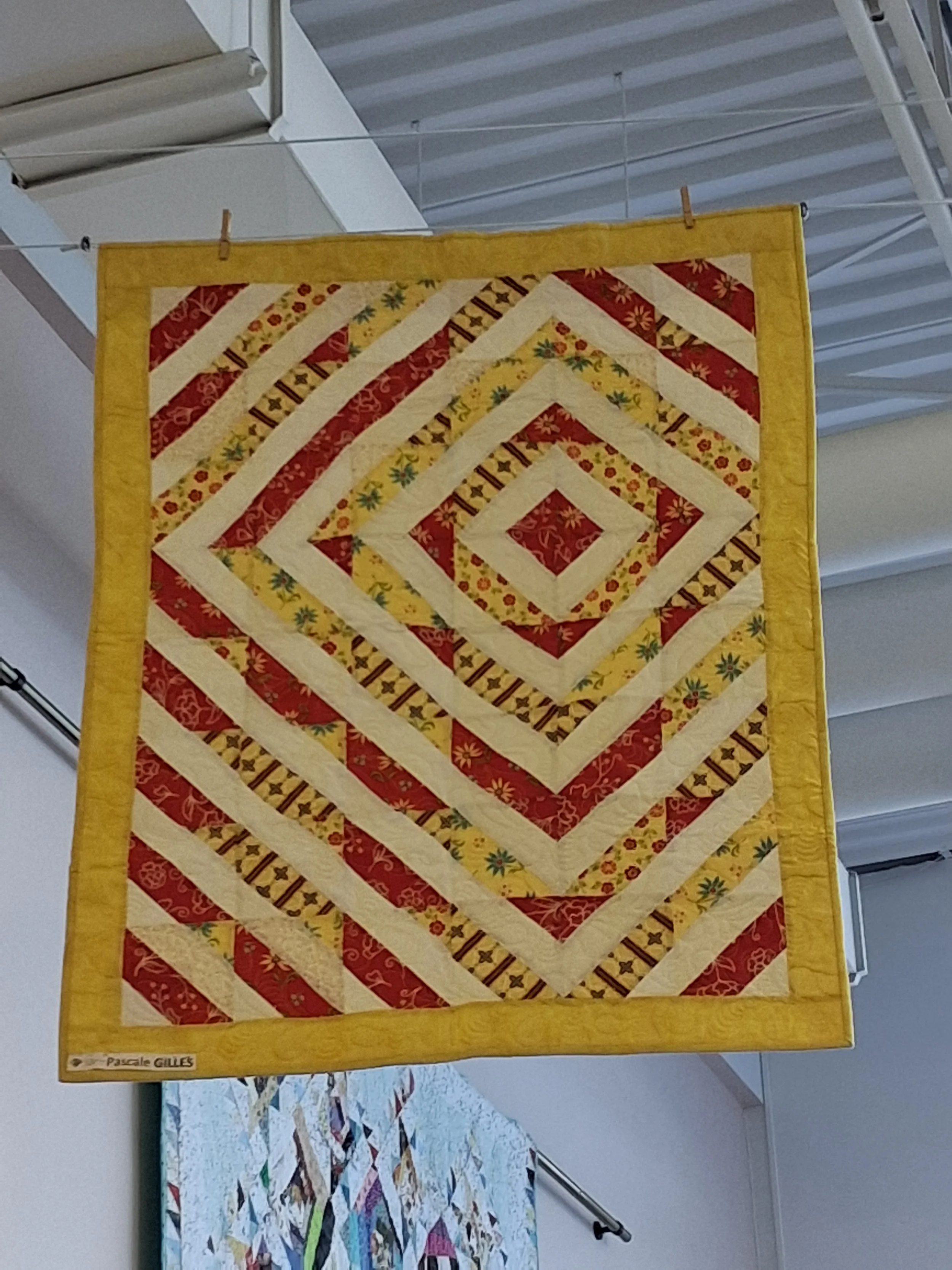 Trois membres de la Guilde ont proposé des courtepointes pour cette nouvelle exposition : Diane Morrissette, Hélène Gautron et Marie-Thérèse Duquette. Nous sommes en mesure de voir l’auteure de chacune des oeuvres sur les photos.