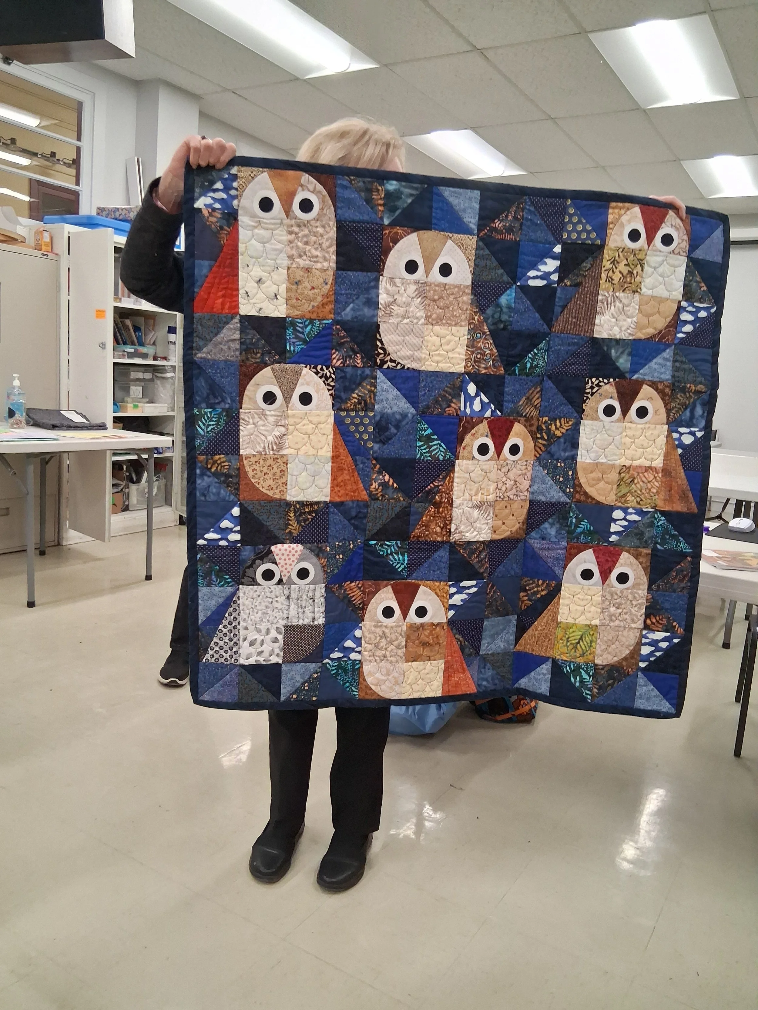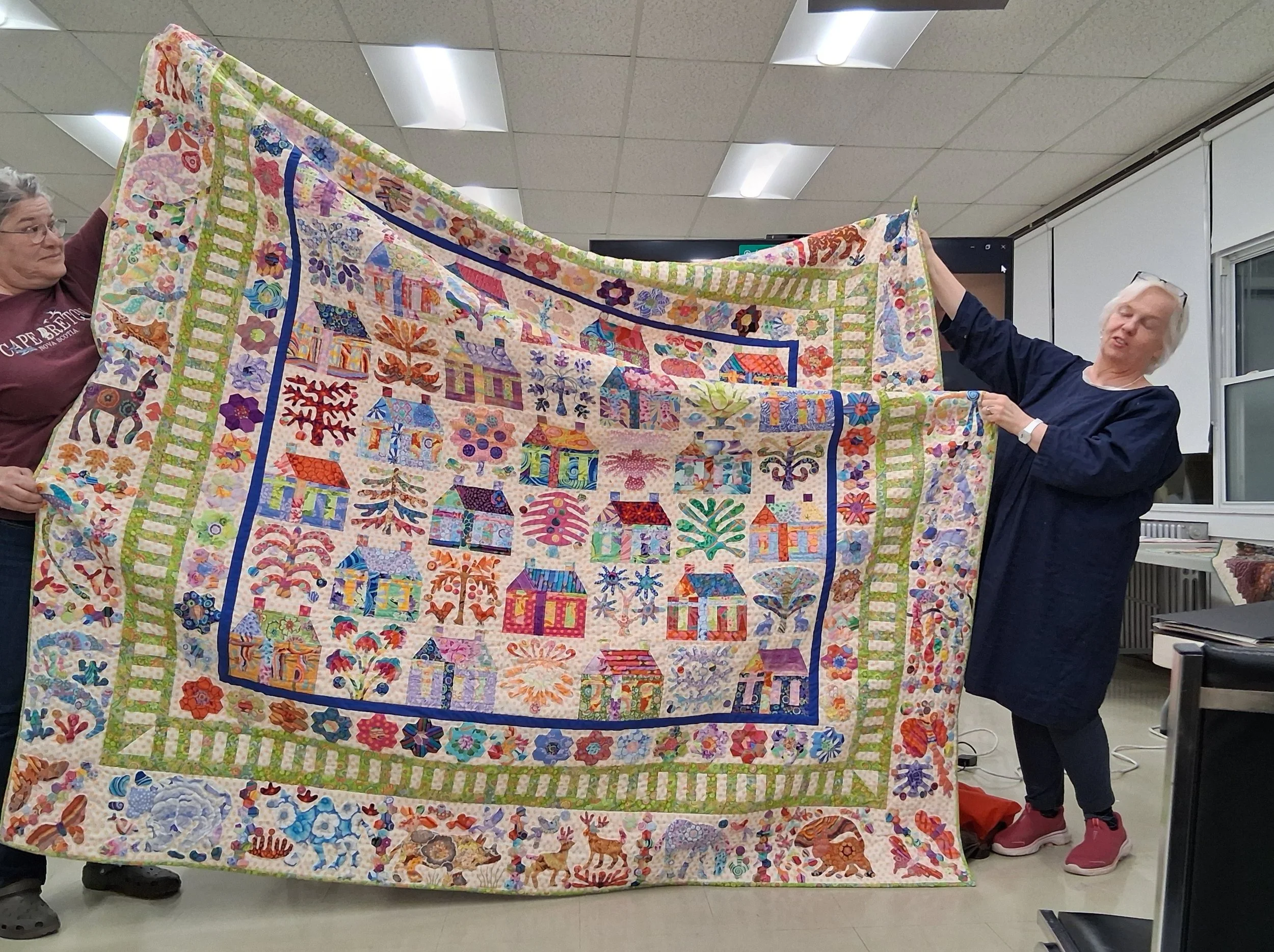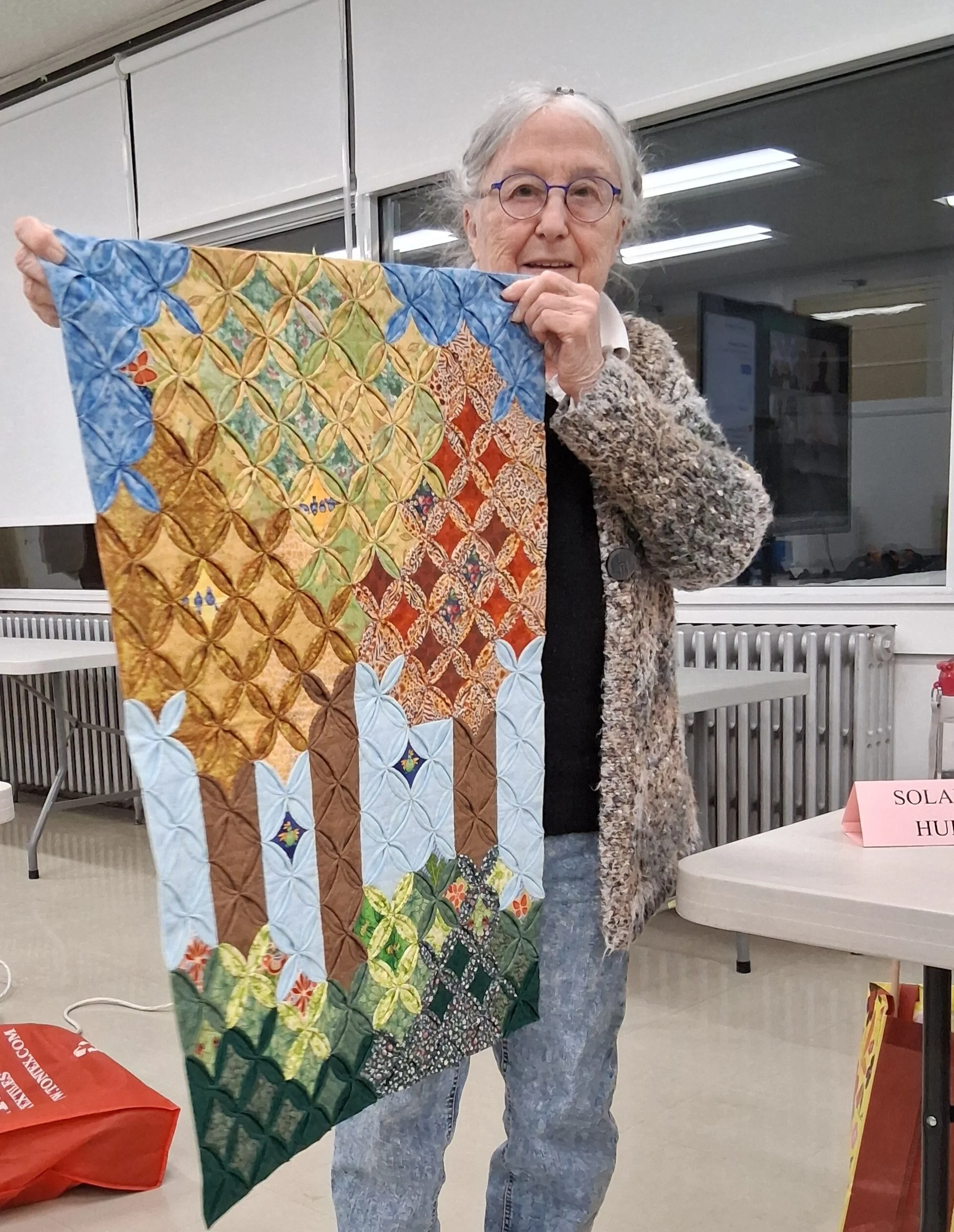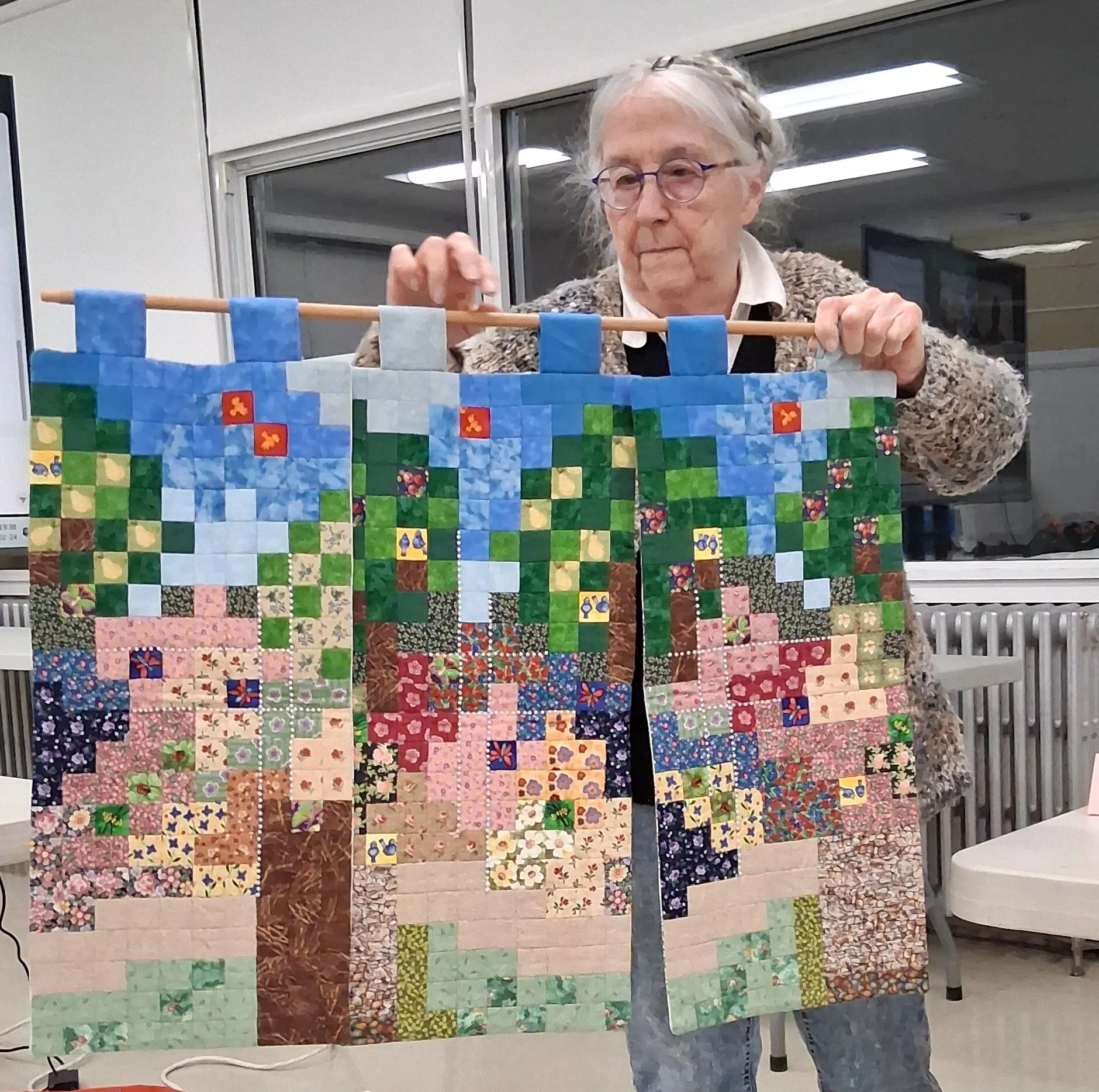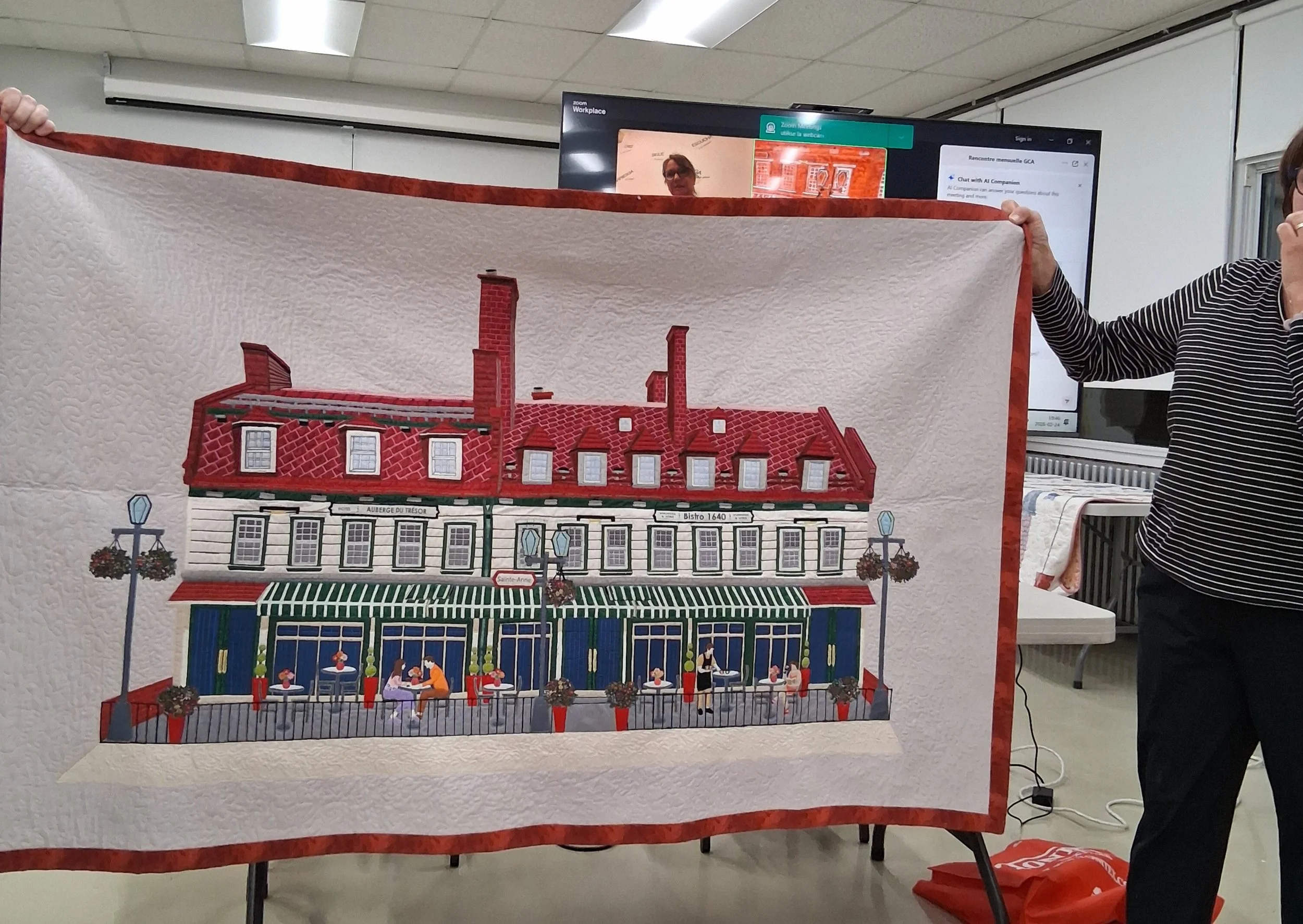Plusieurs autres belles créations ont été proposées. Celle de Gaétane St-Laurent que les participantes aux rencontres du mardi ont vu s’élaborer petit à petit; le beau projet de Judith Laporte sur un chandail qui nous a aussi fait part des défis rencontrés en cours de route; la douceur de la courtepointe de Michèle Gagnon pour un bébé qui vient tout juste d’arriver; l’Auberge du trésor de Québec par Sonia Roy d’après une formation donnée par Édith Choinière dans le cadre du projet 2025 de Courtepointe Québec; l’étui de Danielle Fortin qu’elle a conçu pour être très fonctionnel; l’impressionnante courtepointe de Marie-Claude Lajoie, fruit de 10 ans de travail; la courtepointe de Marie-Thérèse Duquette faite à partir d’un patron de Phillipa Naylor.