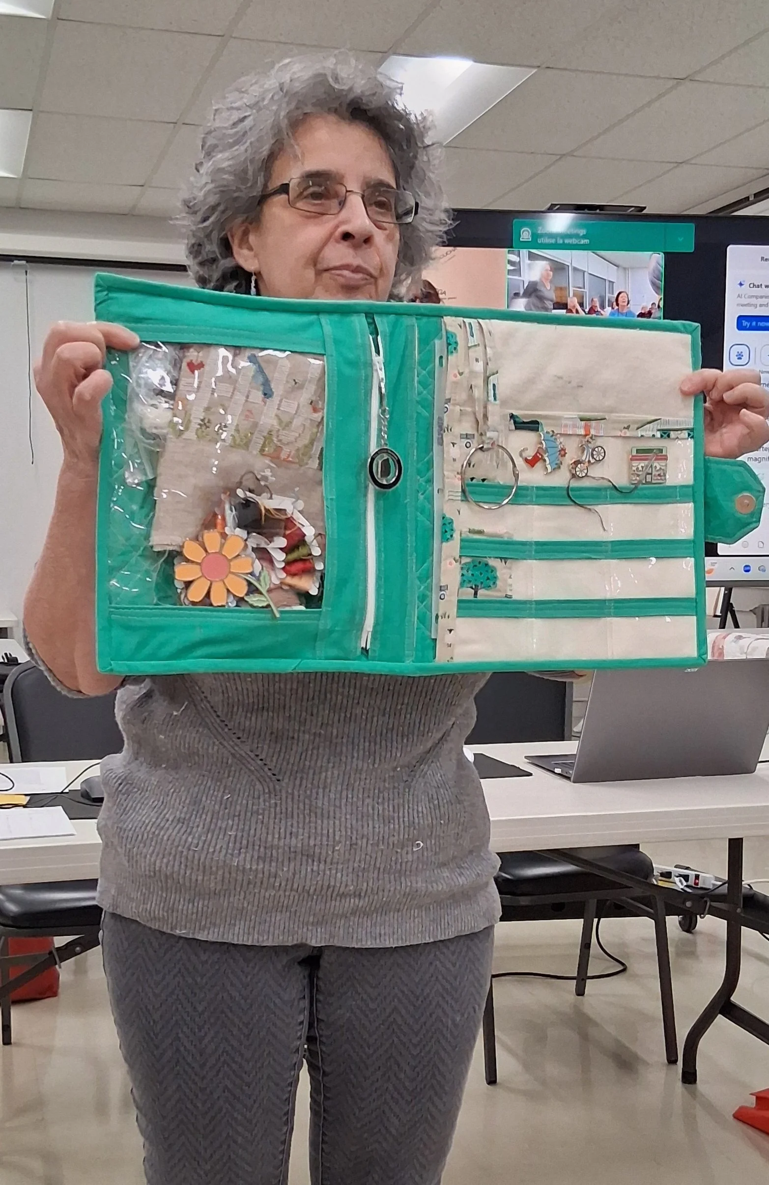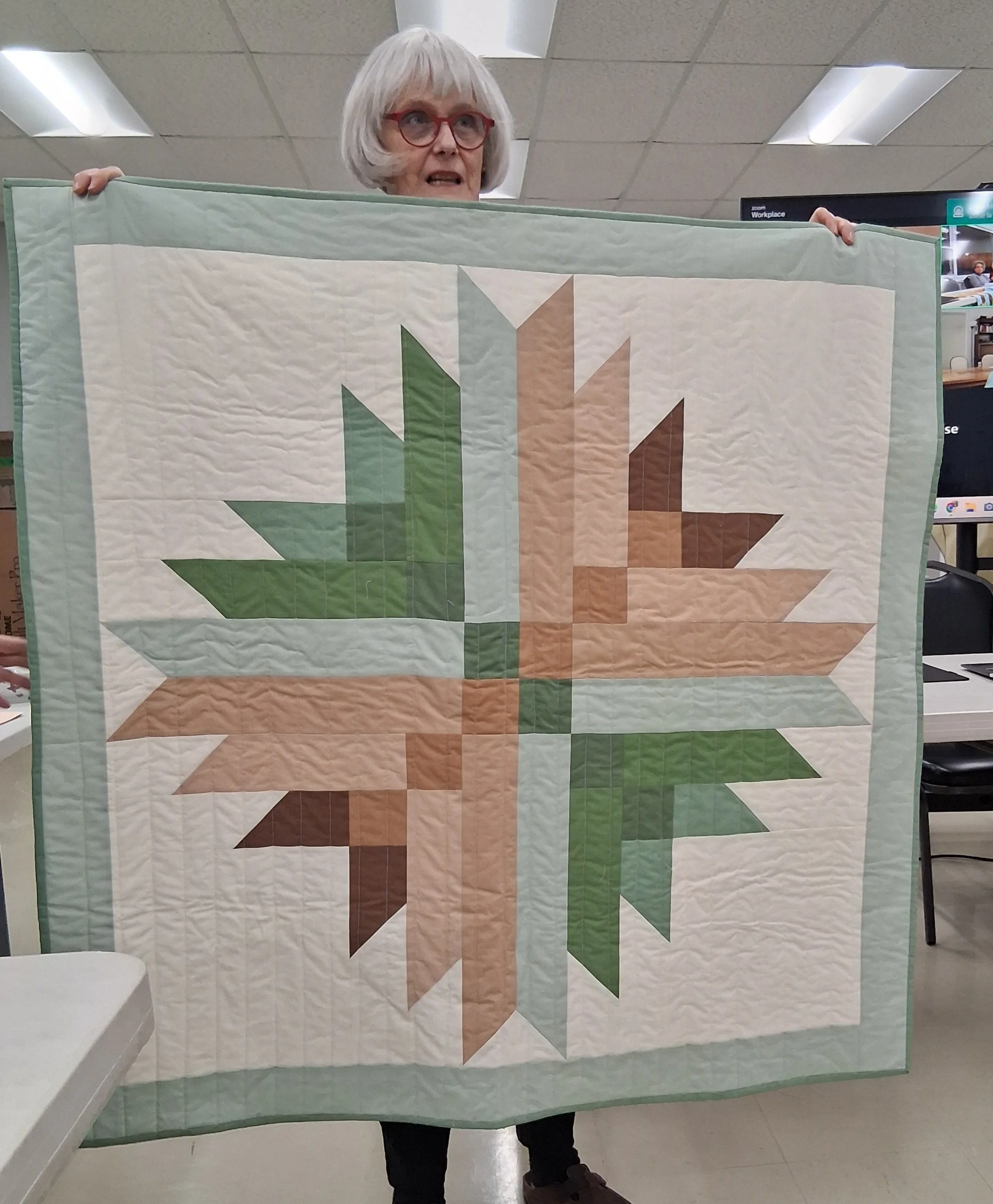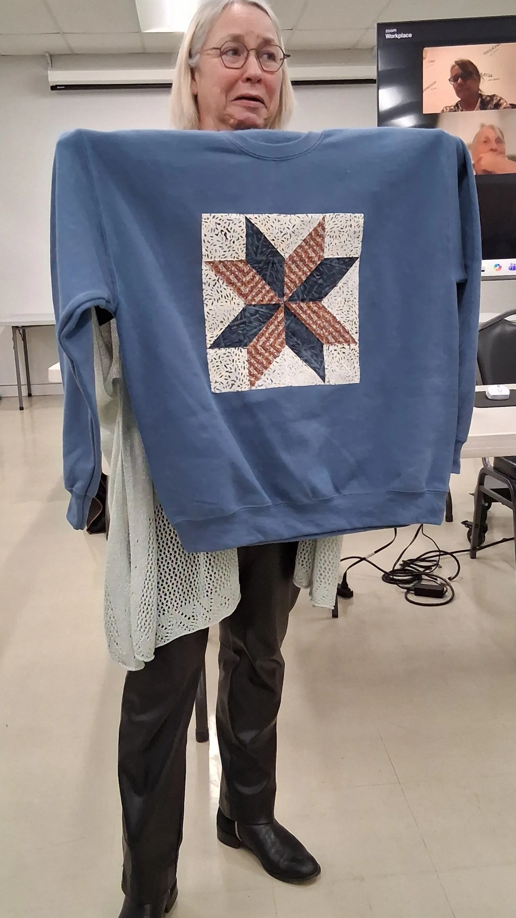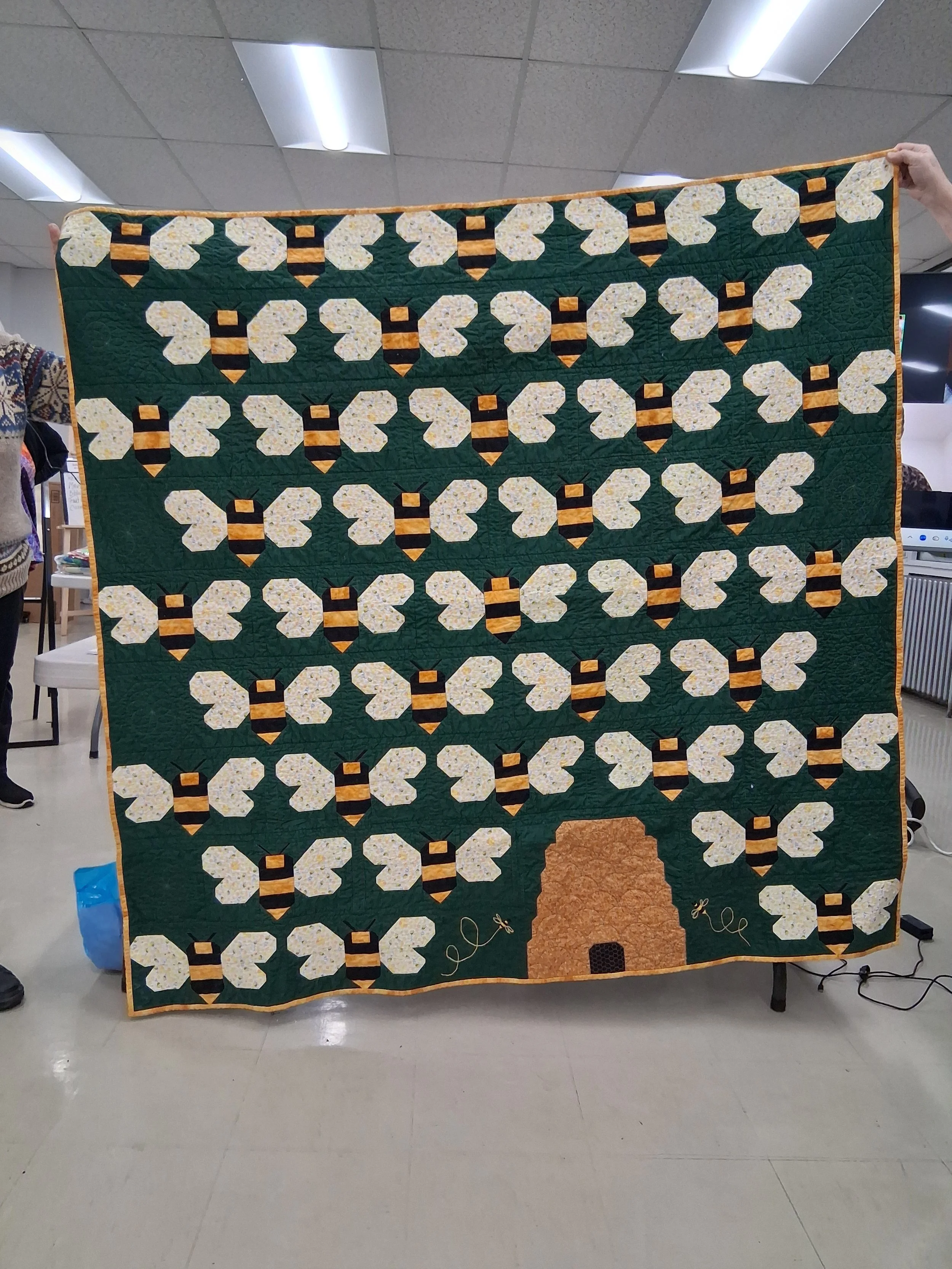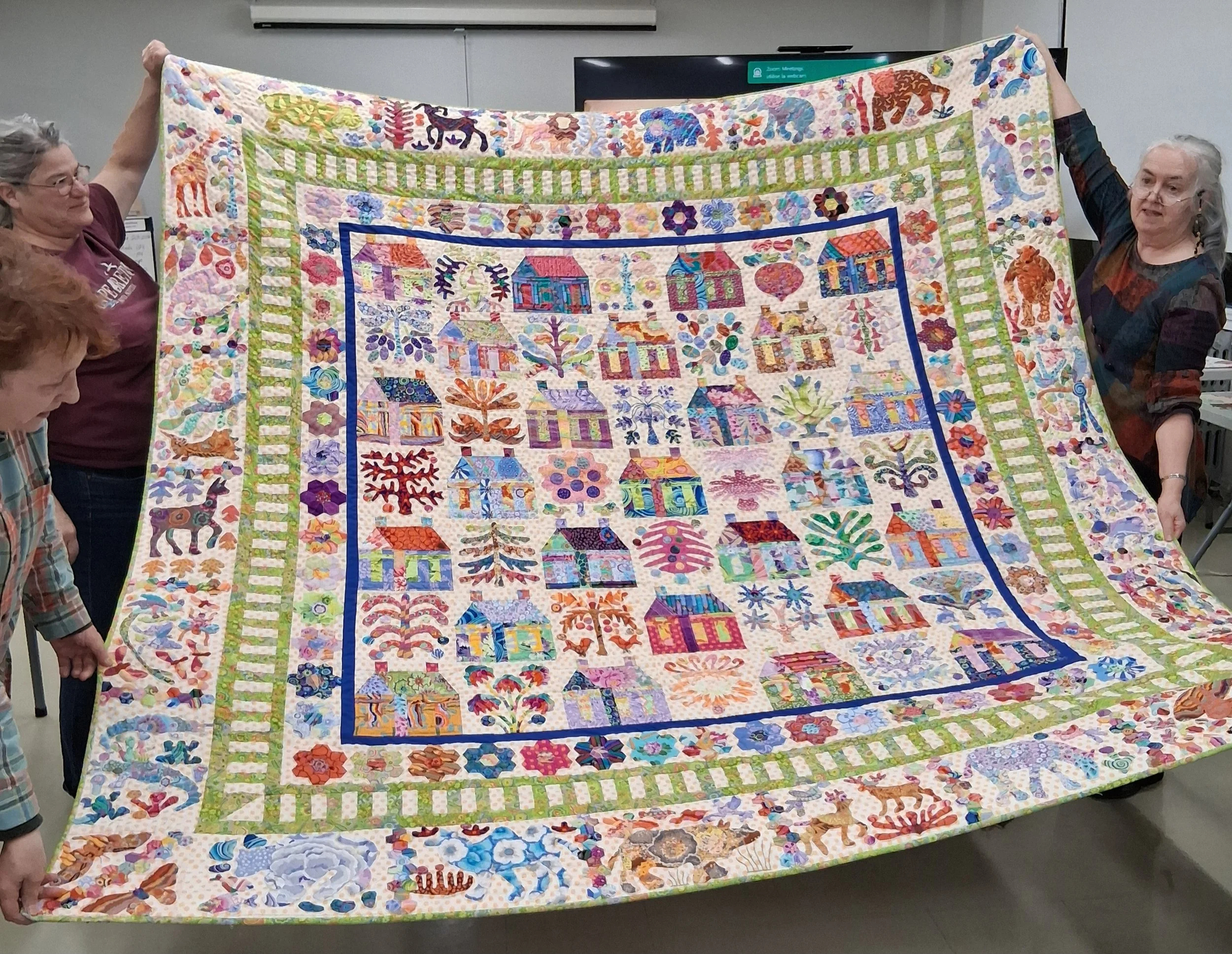 Plusieurs autres belles créations ont été proposées. Celle de Gaétane St-Laurent que les participantes aux rencontres du mardi ont vu s’élaborer petit à petit; le beau projet de Judith Laporte sur un chandail qui nous a aussi fait part des défis rencontrés en cours de route; la douceur de la courtepointe de Michèle Gagnon pour un bébé qui vient tout juste d’arriver; l’Auberge du trésor de Québec par Sonia Roy d’après une formation donnée par Édith Choinière dans le cadre du projet 2025 de Courtepointe Québec; l’étui de Danielle Fortin qu’elle a conçu pour être très fonctionnel; l’impressionnante courtepointe de Marie-Claude Lajoie, fruit de 10 ans de travail; la courtepointe de Marie-Thérèse Duquette faite à partir d’un patron de Phillipa Naylor.