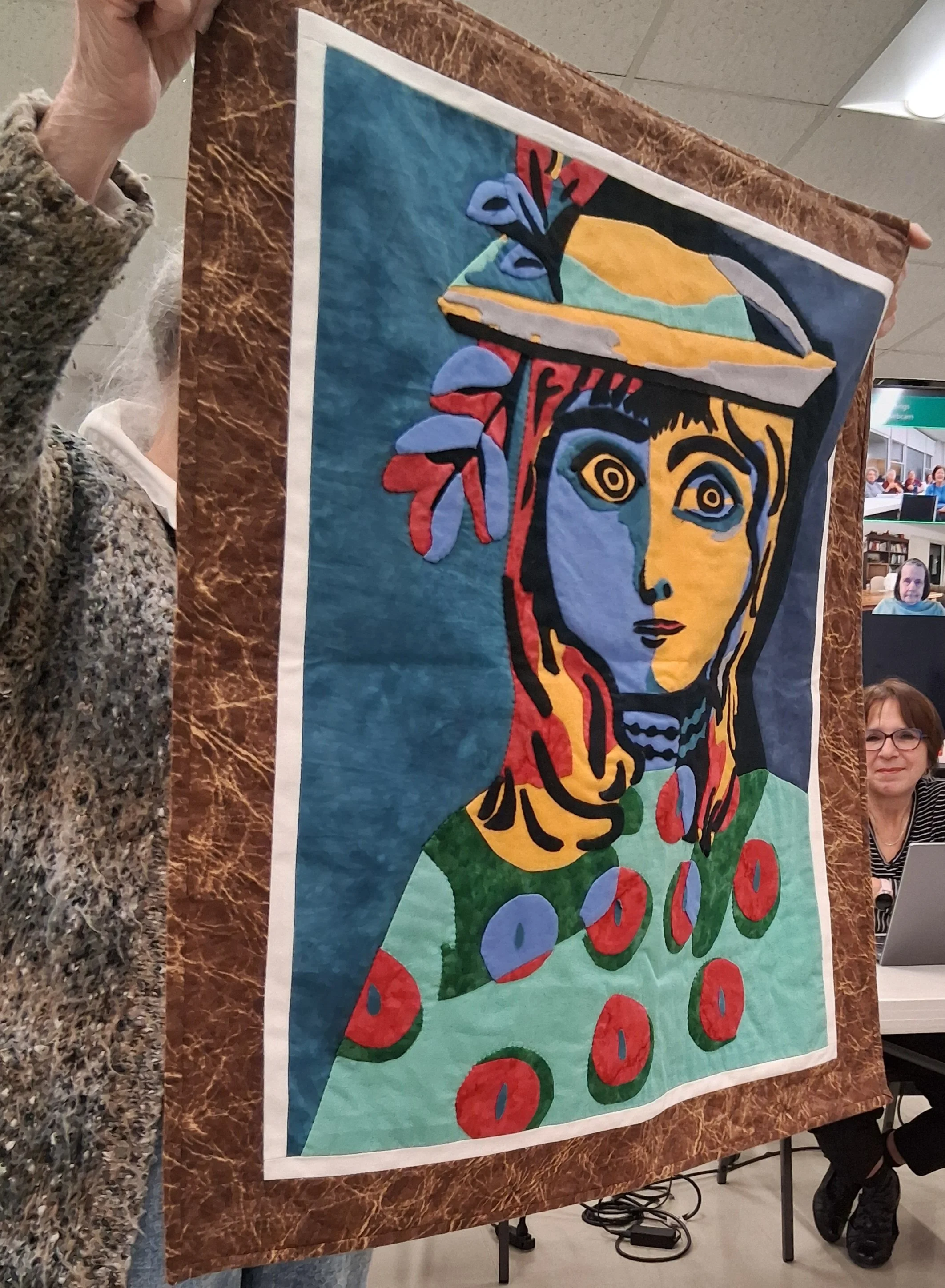 Solanges Hudon nous a présenté certaines de ses oeuvres qui faisaient écho à la formation donnée par Mylène Therrien sur la création de paysages ou la transposition d’oeuvres d’artistes en courtepointe. Voir photos plus ci-bas. (sous l’onglet formation, on peut voir quelques oeuvres créées dans le cadre de ce cours).