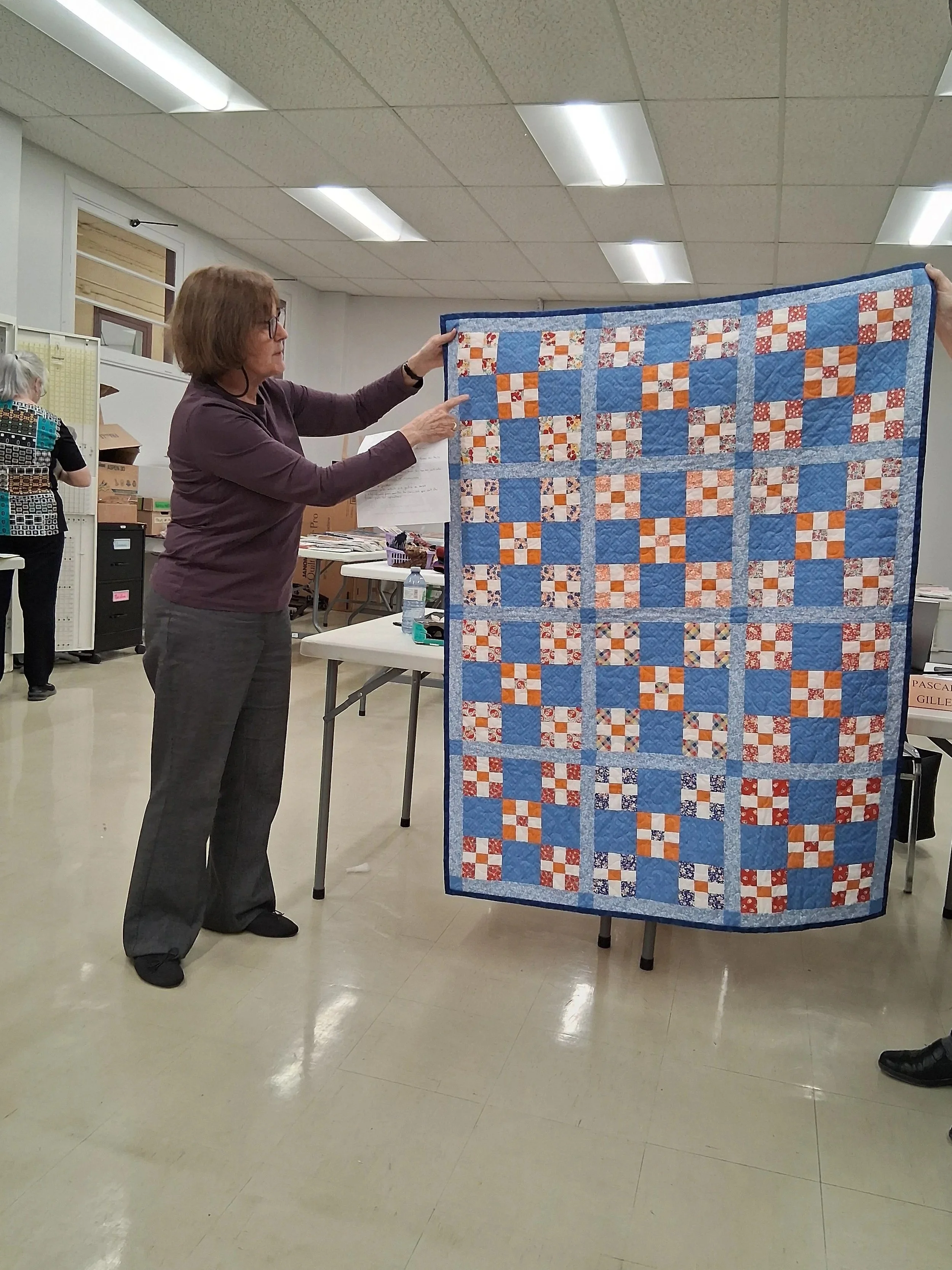 Une occasion pour des membres à la rencontre mensuelle de présenter leurs courtepointes et d’en expliquer les particularités. La photo a été prise le 27 avril 2022. Danielle Roy, en avant plan, nous a présenté sa magnifique courtepointe.